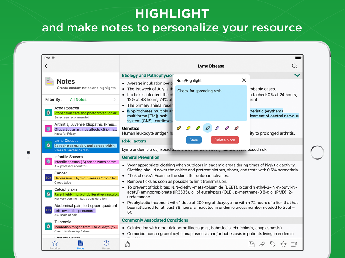 • Create custom notes and highlights within entries