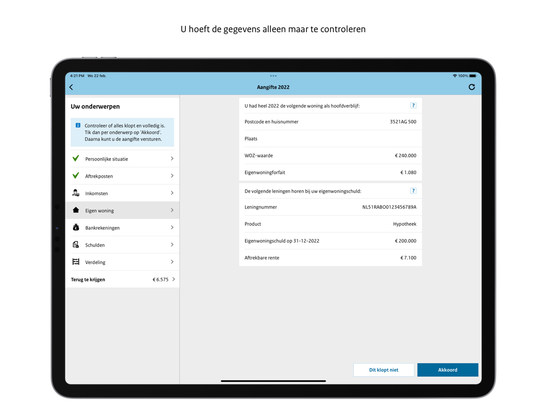 U haalt met uw DigiD uw gegevens op. Daarna controleert u ze. Klopt alles? Dan kunt u uw aangifte meteen ondertekenen en verzenden.