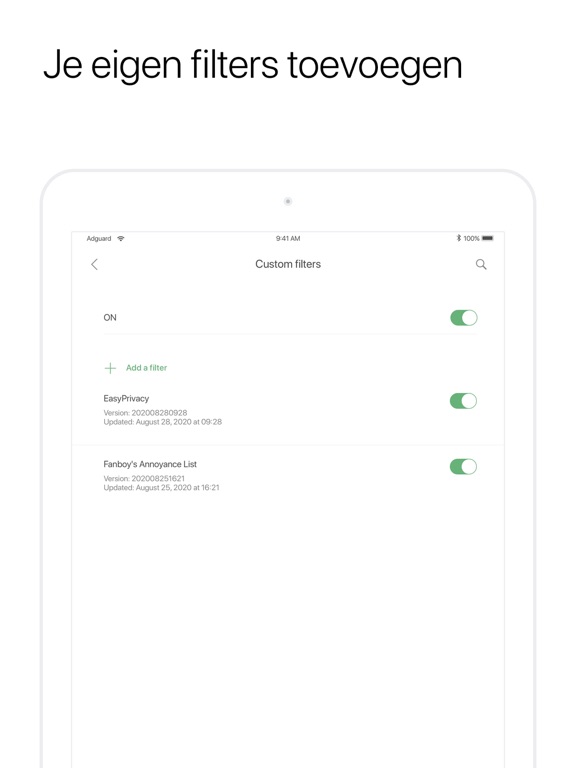 — inclusief populaire adblock filters zoals EasyList, EasyPrivacy, Fanboy's Annoyances en malware domeinen. Blokkeer advertenties zoals een professional met de publieke en AdGuards eigen filters.