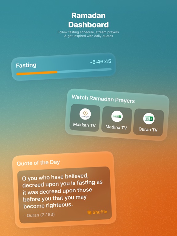 • Access key features quickly, like your prayer times dashboard or Qibla direction.