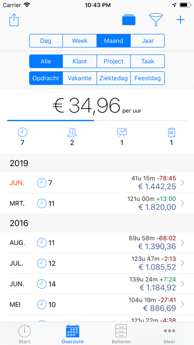 Een mooie toevoeging zou het zijn als je een standaard werktijd per dag in kan vullen zodat automatisch zichtbaar en te filteren is hoeveel overuren je per dag maakt. UPDATE. Na een mailtje van de ontwikkelaar die uitlecht dat deze optie er in zit en waar deze is te vinden heb ik de beoordeling herzien naar 5 sterren.5door Dht****27/10/2024