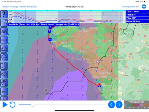 - High compression of weather data on several models (GFS, Arpege, Icon, NAM Caraïbes et USA East) enabling to reduce by up to 95% volume of data, very efficient for satellite transmission (Iridium Go, Iridium Inmarsat, etc)