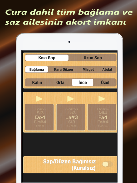 İleri düzey kullanıcılar ayrıca Sap/Düzen bağımsız modda, kendi istedikleri notaları özgürce seçip onlara göre de akort yapabilirler.