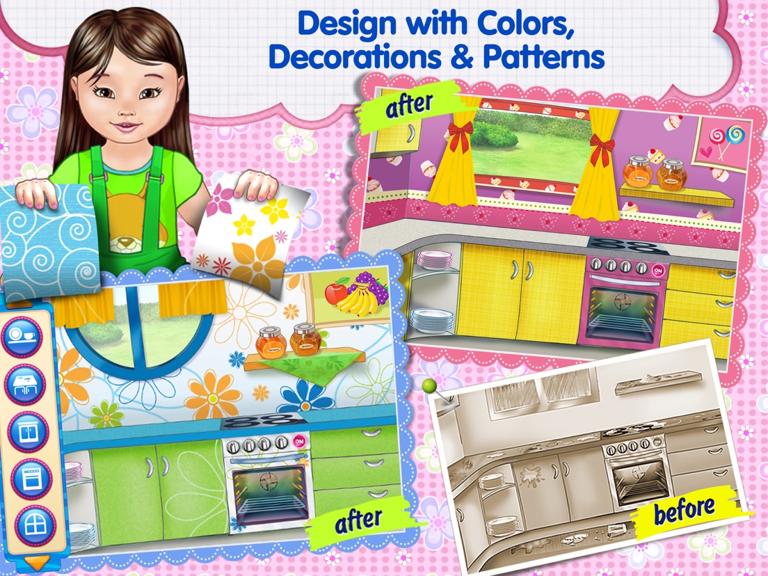 Now you can move on to fun in the kitchen! Make the countertops shine and floor sparkle with your special cleaning skills! Once you’ve tidied up, transform the ordinary old kitchen into the kitchen of your dreams with endless makeover options! You’ll even get the chance to feed your baby once you’ve completed the makeover.