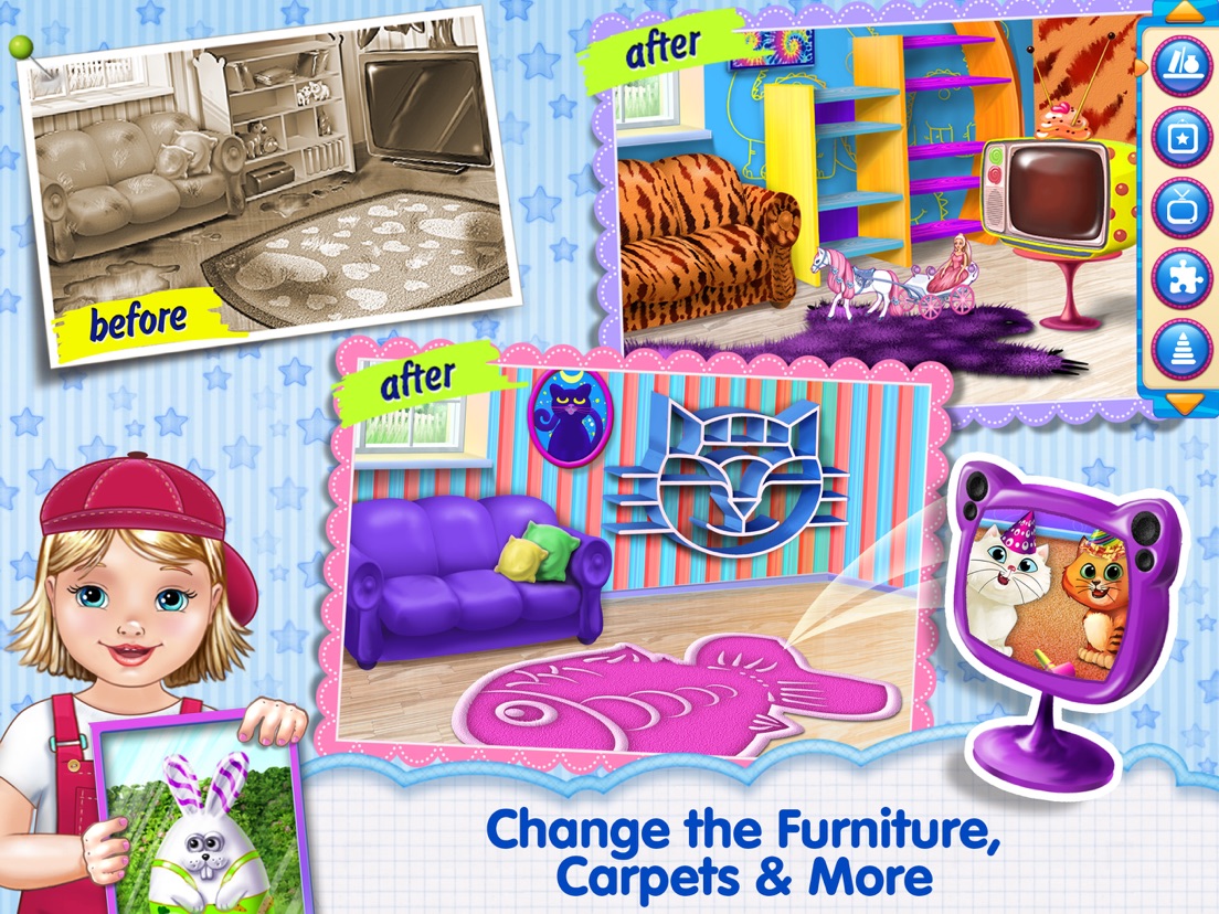 Move on to the living room, where you can clean with a vacuum, duster, and other cleaning tools. Then change the furniture and carpet, and pick out a new TV and bookshelf to match the decor! Play puzzles in your brand new room with your adorable baby! With this fun app, you can be a true renovating renegade!