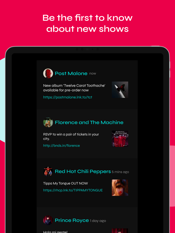Bandsintown helps you discover concerts near you and notifies you of upcoming gigs by artists you listen to, so you’ll never miss another show.