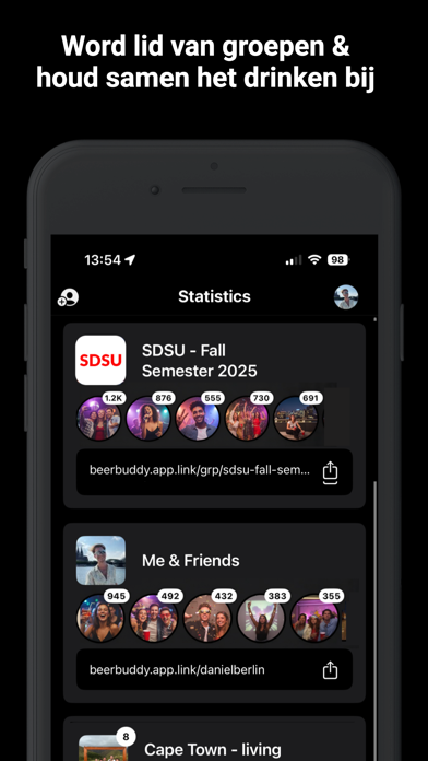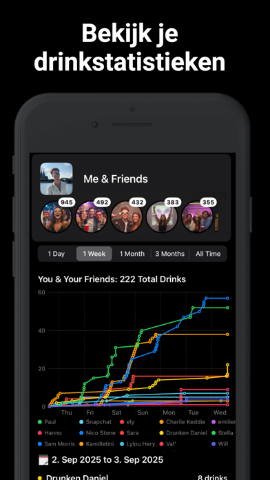 Geen oordeel – alleen fun. Zie hoeveel je hebt gedronken, ontdek wat je vrienden drinken en wie deze maand het meest actief is.