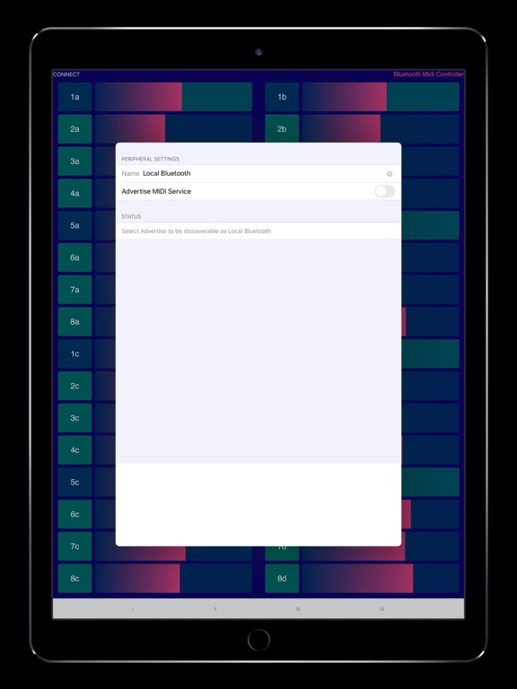 Push connect button and in the opened view turn on the switch button. This will make your device discoverable by your Bluetooth MIDI host, connect it from it and you will can control your MIDI host from B.M.C.. If your MIDI host don't support Bluetooth MIDI there are some free apps on the market that creates virtual Bluetooth Midi Ports.