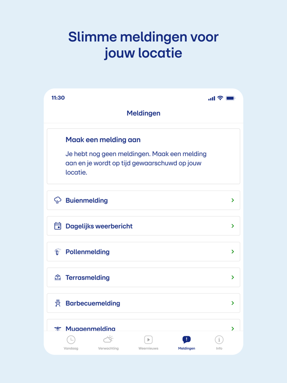 In de “Meldingen” tab kun je een regenmelding (push notificatie) aanmaken zodat je direct een bericht krijgt zodra wij met voldoende zekerheid kunnen zeggen dat er bij jou thuis of op jouw favoriete locatie een regenbui gaat vallen. Ook kun je een dagelijks weerbericht instellen voor jouw locatie. Je kunt deze meldingen aanpassen naar de tijden en locaties waarvoor jij een regenmelding wil ontvangen, bijvoorbeeld in het weekend en/of doordeweeks. Daarnaast hebben we ook nog extra meldingen zoals de muggenmelding, bbqmelding, UV-melding, etc.