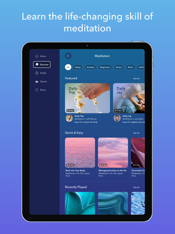* Focus on a goal with Dailies - Reduce anxiety with daily 10-minute original programs like the Daily Calm with Tamara Levitt, the Daily Trip with Jeff Warren, or the Daily Jay with Jay Shetty