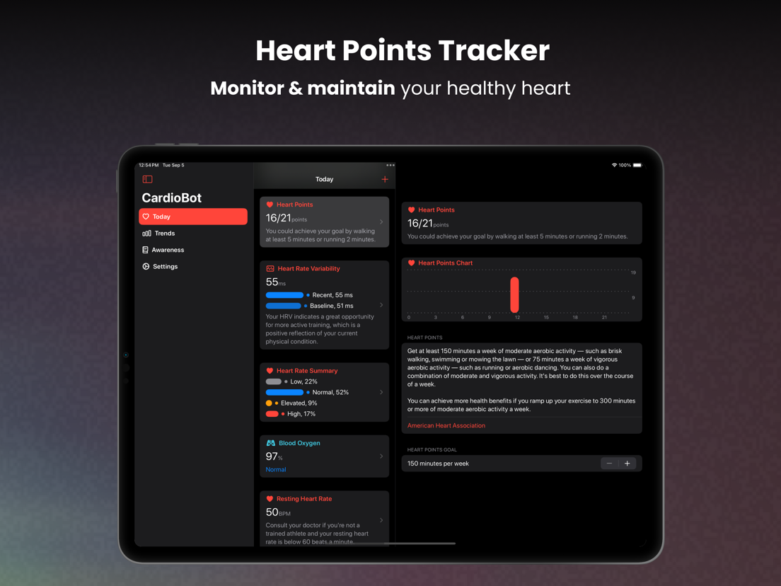 CardioBot uses the studies provided by the American Heart Association to build smart recommendations that help you to improve your cardiovascular system and maintain good health. App reads heart rate data measured by the Apple Watch and separates readings in low, normal, elevated, and high heart rate through different colors and charts, allowing you to see averages at a glance.