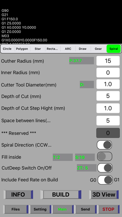 The application has G code build function modules which are circle, polygon, star, rectangle, arc, draw, gear and spiral modules.