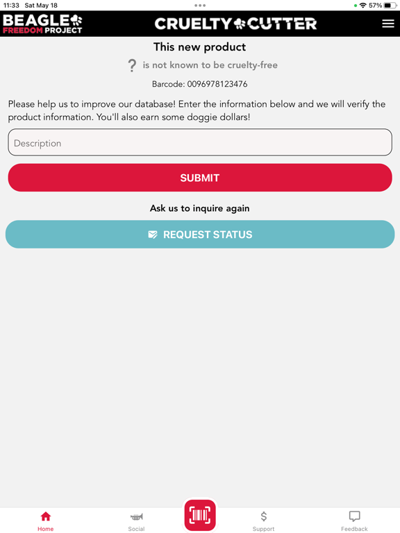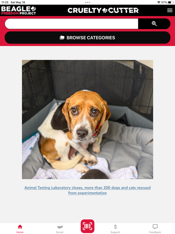 Cruelty-Cutter is also your activist app! Once you scan a product's barcode, share the results on social media and also share your concern or praise with the company itself. Companies that still choose to test on animals will get the message that Cruelty-Cutter users are against what they are doing, while companies that chose NOT to test will receive your praise!