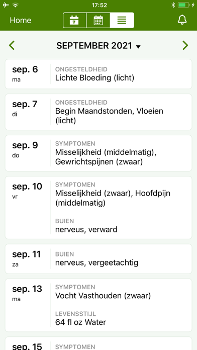 * Bekijk je huidige en toekomstige ongesteldheid data, ovulatie en vruchtbare dagen, je buien en je symptomen in een eenvoudige maand kalender.