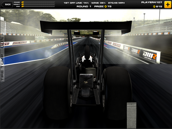 Before each pass drivers are allowed to perform a burnout which cleans and heats the driving tires for improved traction. Watch the temp bar on the left but be careful, too much throttle will overheat the tires and reduce grip!