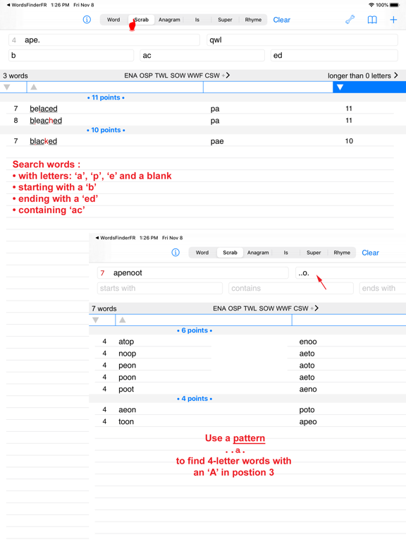 Solve crossword puzzles, cryptograms, Wordfeud, Scrabble™, or just check your spelling. Sort by word length, alphabet or score to find not just the longest words, but the words with the highest score!