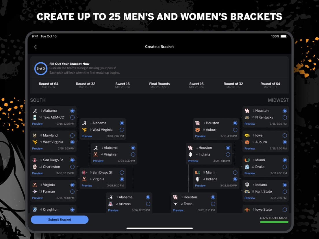 The #1 bracket app is back and better than ever for the 2026 NCAA Men’s and Women’s College Basketball tournaments! Compete against friends, ESPN personalities and celebrities to see who finishes with the best bracket. It’s completely free to play with over $370K in total prizes across all four bracket games!