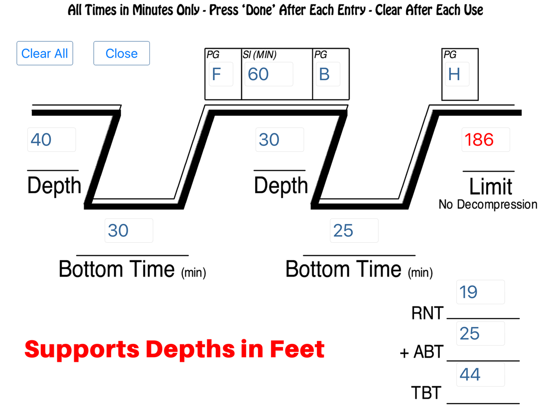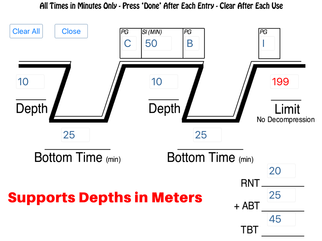 To calculate your pressure groups just enter your depth (feet or meters) and time (min) for your first dive. Then enter your surface interval between dives in minutes. After that enter your second dive depth and time the same way, and the program will calculate your final PG, ABT, RNT, TBT and new no decompression limit.