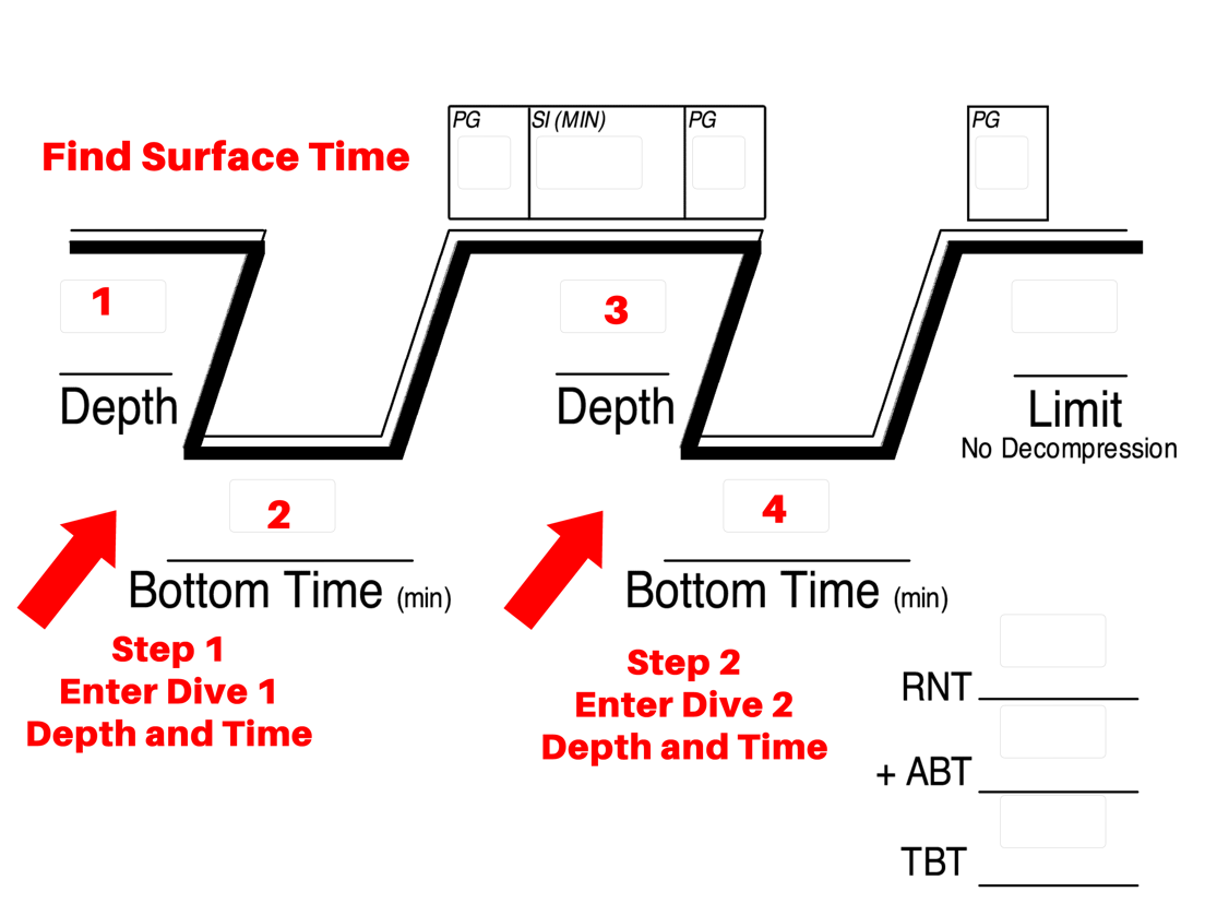 To calculate your minimum surface interval between dives enter the depth and time of your first dive. Then enter the depth and time of your second dive. The program will now find your minimum surface interval and then calculate your final PG, ABT, RNT, TBT and new no decompression limit.