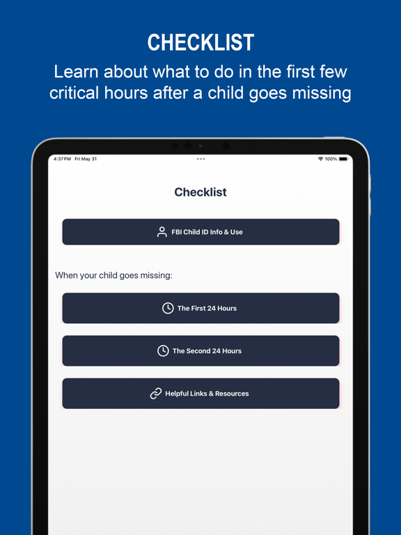 The app includes tips on keeping children safe, as well as specific guidance on what to do in the first 48 crucial hours after a child goes missing. Links to additional resources for families and victims are also provided.