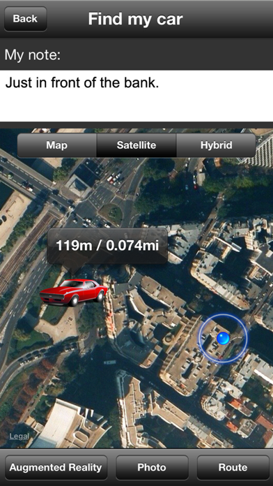 1. Open Find My Car application and save your car position on the map. You can also take a picture and associate a short description to help fully document the parking spot.