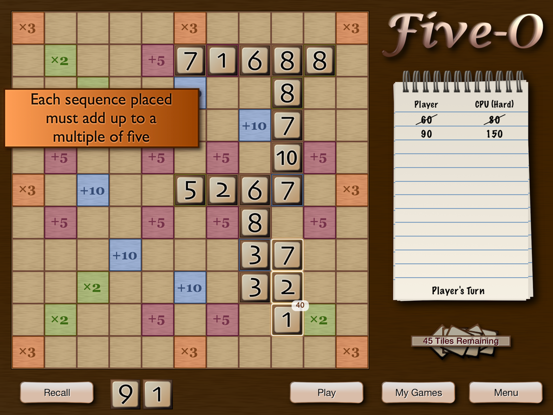 Instead of letters, you place number tiles, forming sequences that must add up to multiples of five, with no more than five tiles per sequence. Think strategically, maximize your bonuses, and outscore your opponent!