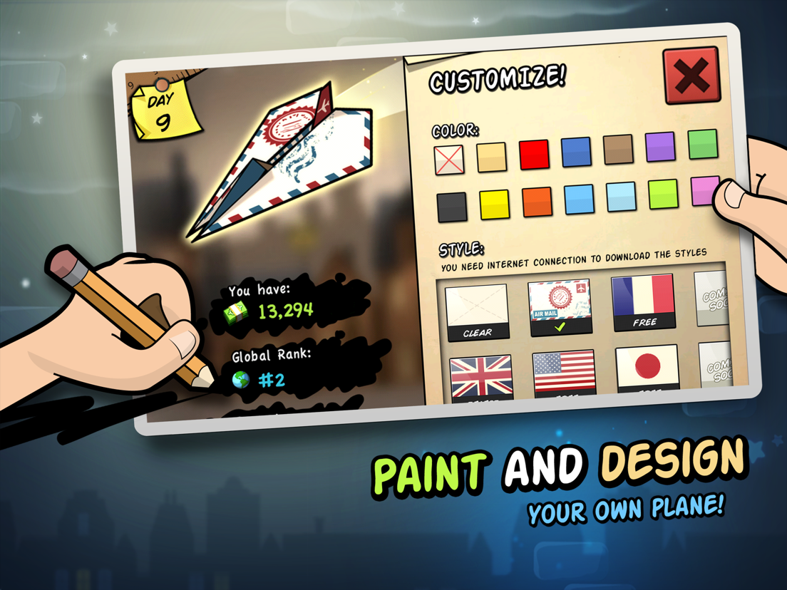 Throw your paper airplane from one country to the next as you soar through beautiful, charming environments. Steer your plane to catch shooting stars and origami cranes, or even shoot beyond the atmosphere!