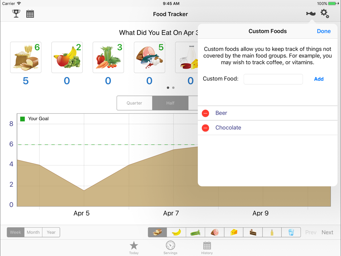 - Custom food categories for anything else you want to track