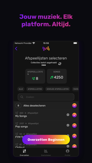 Du hast deine Playlists über Monate oder Jahre hinweg aufgebaut? Fang nicht von vorne an. Mit Free Your Music kannst du Musik übertragen, Playlists importieren und Musikbibliotheken konvertieren – in nur wenigen Sekunden. Kein Kopieren und Einfügen, keine manuelle Einrichtung, keine verlorenen Songs.