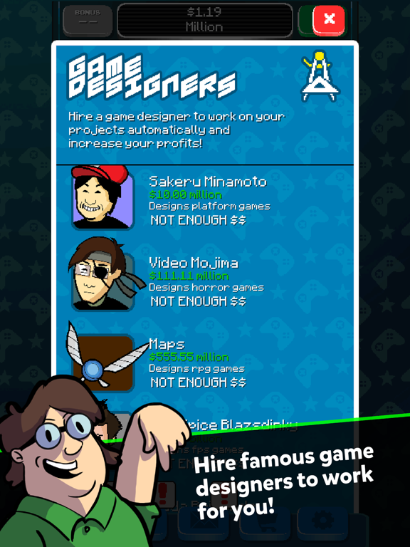 To grow your company, hire new employees, get upgrades, and expand your fan base (as well as potential $$customers$$) with the social media simulator. You can also obtain new resources by earning points from the 10 classic retro games available to play! The world of video games needs a new stand-out personality, a new hero of game design, a new unstoppable gaming ruler: it needs someone like YOU!