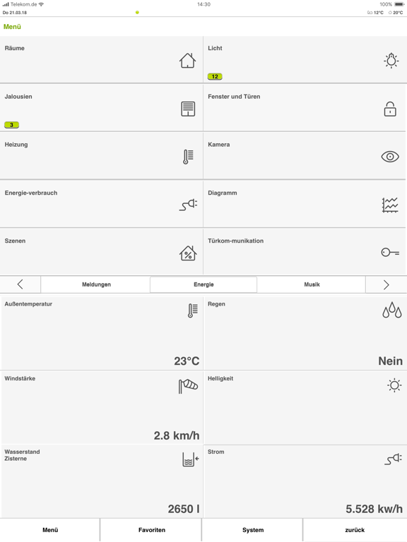 De functies in een ruimte en hun status zijn in een oogopslag te overzien en kunnen met een touch worden bediend. Bij complexere functies, zoals b.v. de verwarmingsbesturing, opent er een pop-upmenu. Wanneer het apparaat 90° wordt gedraaid, biedt het dwarsformaat een ruimer aanzicht op de tijdschakelklokfuncties.
