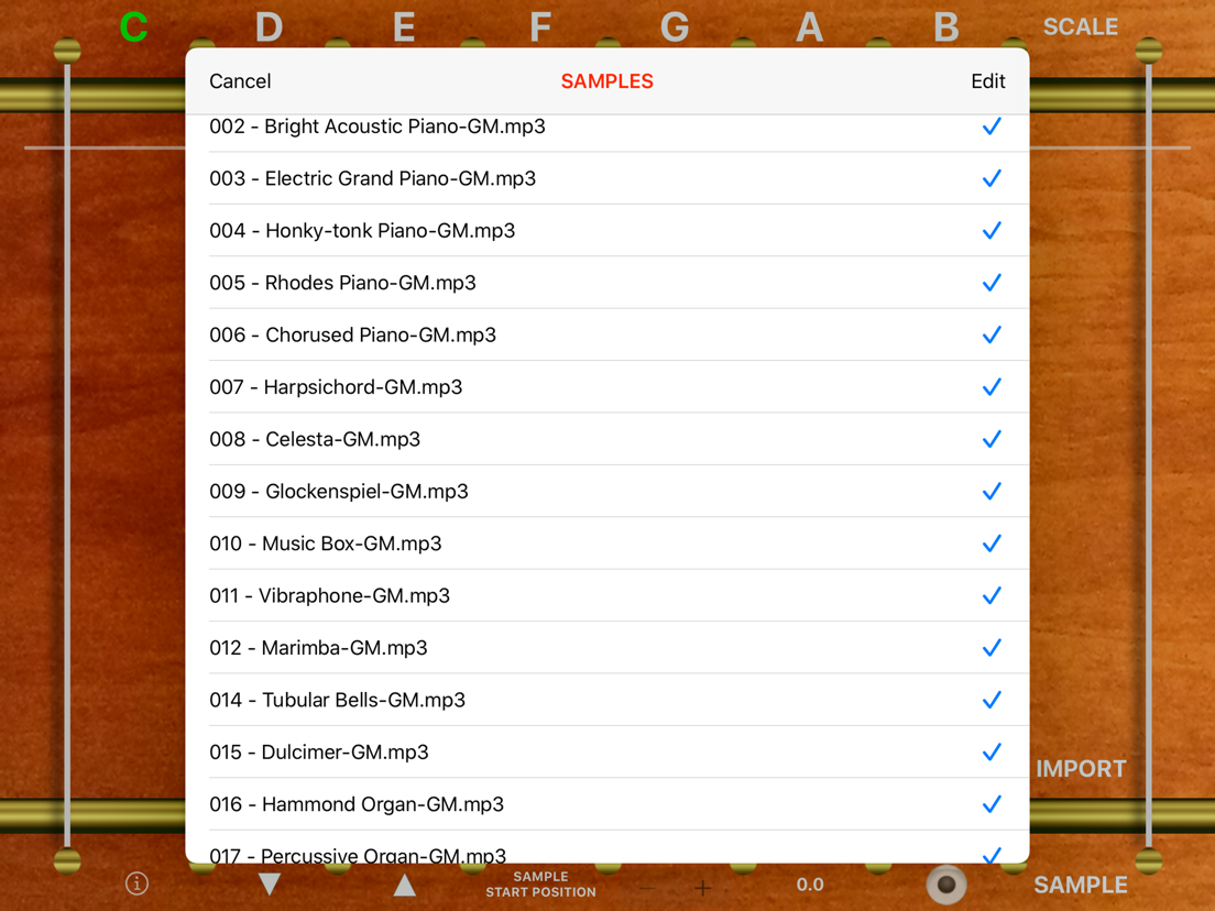 Il software è in grado di leggere tutti i file/campioni audio compatibili con il Vostro dispositivo portatile (.wav, .mp3, .m4a, .caf, ecc…); potrete quindi creare il Vostro suono (è necessario un solo file audio) utilizzando i comuni wave editor per MAC o PC, aggiungere riverbero, chorus, effetti speciali (potete manipolare il suono come meglio desiderate), salvarlo nel formato che desidererete e utilizzare harpSampler per creare automaticamente lo strumento musicale completo, da suonare come una arpa.