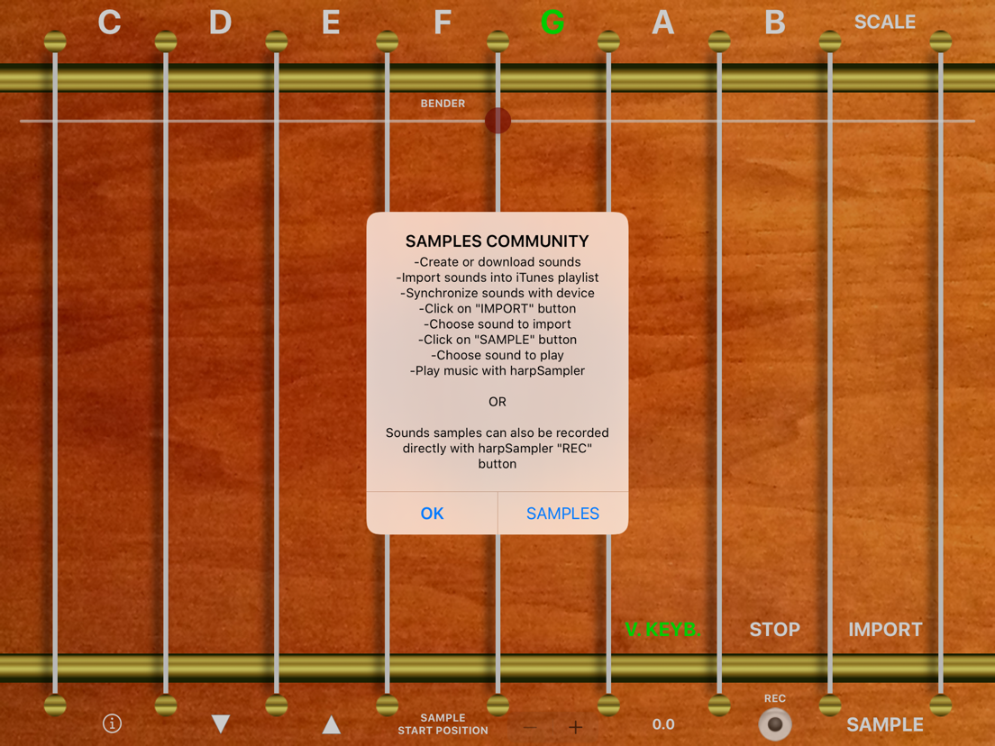 Una volta importato il campione sonoro harpSampler creerà automaticamente lo strumento "arpa" completo (8 ottave); a questo punto potrete suonare dal vivo la Vostra arpa (con il suono da voi creato o utilizzando il suono "ARPA" di default fornito con l'applicazione) o divertire i vostri amici con una scala di effetti speciali (arpa style) da voi scelti.
