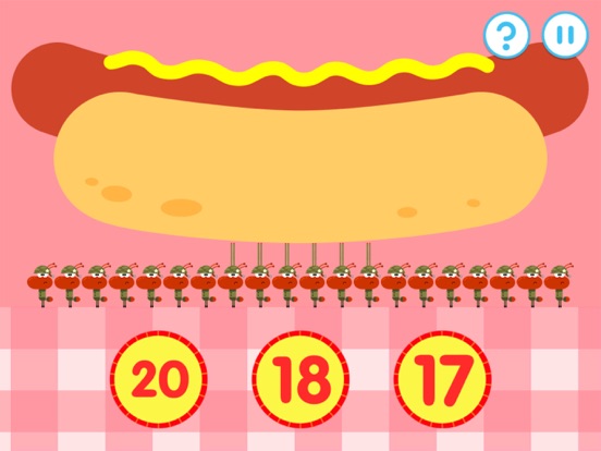 • Identify the number that shows how many ants are holding up the hotdog. You'll also need to choose the correct number of penguins, rabbits and birds.