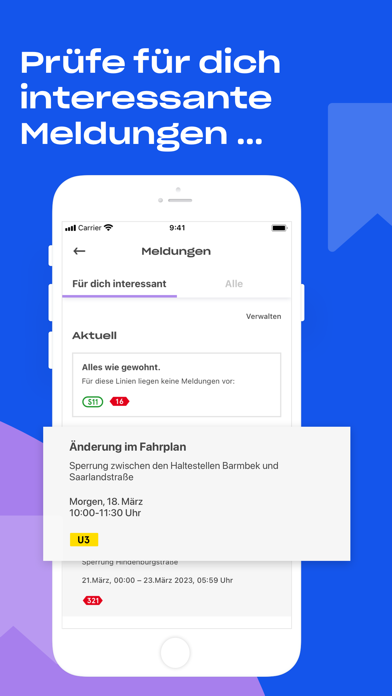 Bleib stets auf dem neuesten Stand. Unter “Meldungen” werden dir alle Meldungen für deine favorisierten Linien übersichtlich angezeigt. Zudem kannst du Alarme für Linien, Wochentage und Zeiträume erstellen und dich bei einer Störung via Pushnachricht warnen lassen. Ob Bauarbeiten, Sperrungen oder Ausfälle, mit der hvv App bist du für jede Situation gewappnet.