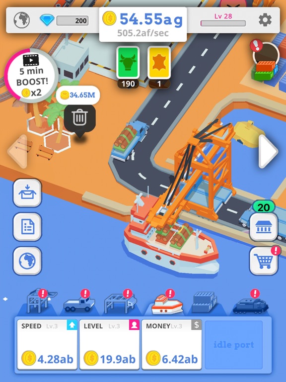 Keep counting that coin as ships doc in your harbor, bringing you even more shipping containers. Tap to increase your specs, gain more materials, build your empire and level up to the max!