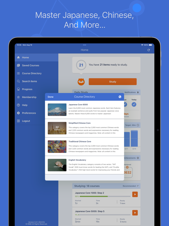 Official courses are offered for studying Japanese, Chinese, and SAT English. The Japanese courses cover the 6,000 most commonly used words in Japanese. The Chinese courses cover the 2,000 most commonly used words in spoken Chinese and over 1,200 words commonly used in newspapers and magazines. (All Chinese courses are available in both Traditional and Simplified Chinese.) All words have sample sentences and audio.