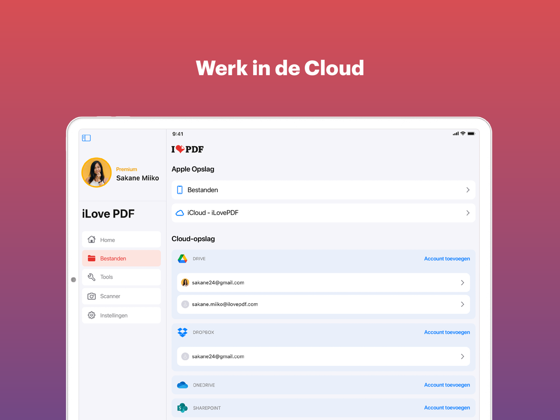 Maak verbinding met je Google Drive en Dropbox account om documenten uit de Cloud te selecteren en te delen.