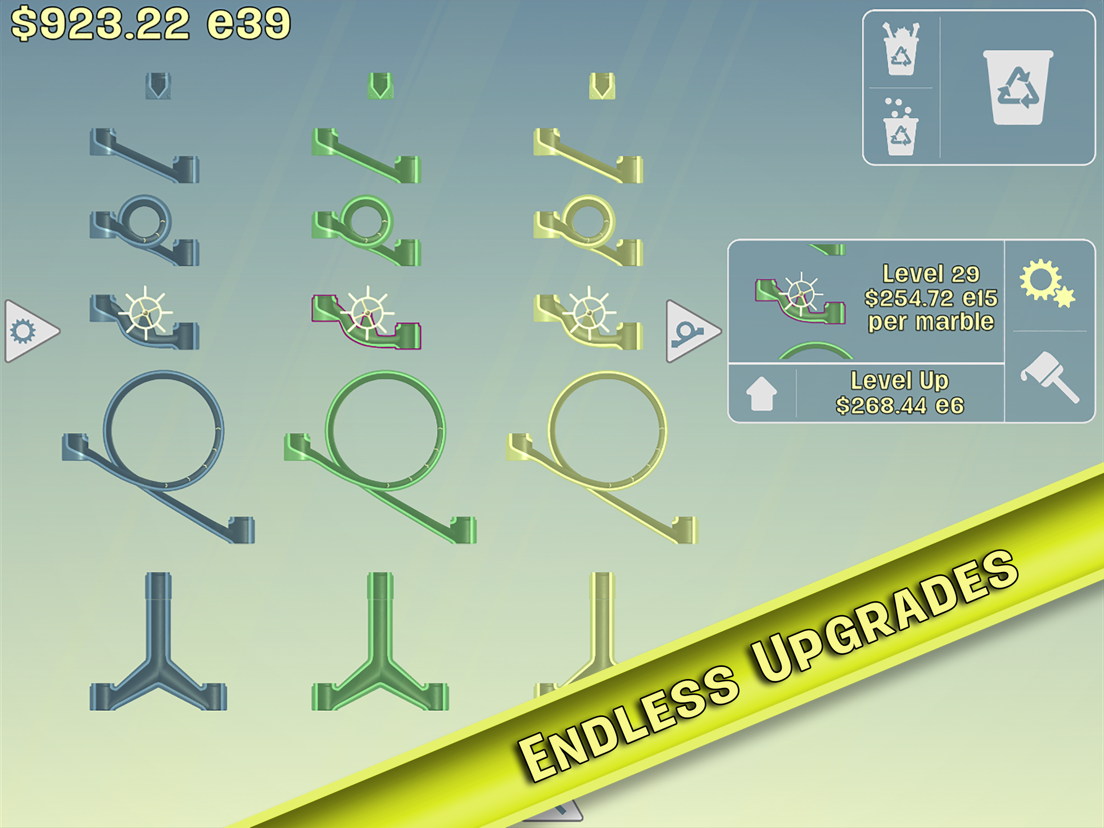 This free to play marble run construction kit with tycoon game trappings lets you build massive marble slide towers using over 30 unique pieces. Enjoy the ASMR rolling and clacking sounds of marbles on plastic. Get mesmerized by the realistic (and sometimes supernatural) physics of a never-ending stream of marbles. Start small, earn money, spend it on upgrades to earn more, build more slides, and create the marble slide world of your dreams!