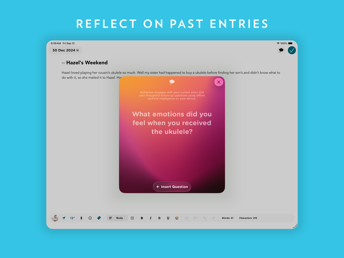 * Reflections: Ask follow-up questions on your recent or current journal entries to inspire deeper writing. Powered by on-device, offline artificial intelligence. (Requires iOS 26 or iPad OS with Apple Intelligence enabled.)