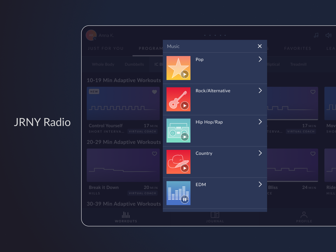 The JRNY membership offers personalized cardio, strength, and whole-body workouts that evolve as you do. It gets to know you by assessing your fitness level and recommending workouts based on your abilities, available time, how you're feeling, and more.