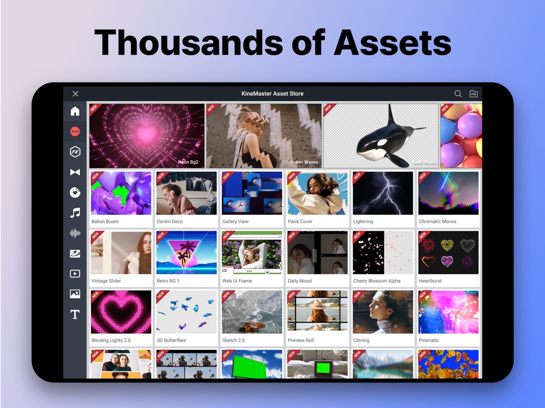 De KineMaster Asset Store heeft tienduizenden middelen om je volgende video geweldig te maken! Effecten, stickers, muziek, lettertypen, overgangen en VFX.