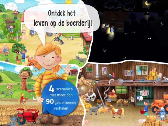 ++ Er zijn vier scenario’s met ongeveer 90 verborgen animaties en dingen om te ontdekken. Kind en ouder ervaren hoe het is op de boerderij via allerlei gekke, gedetailleerde verhalen: