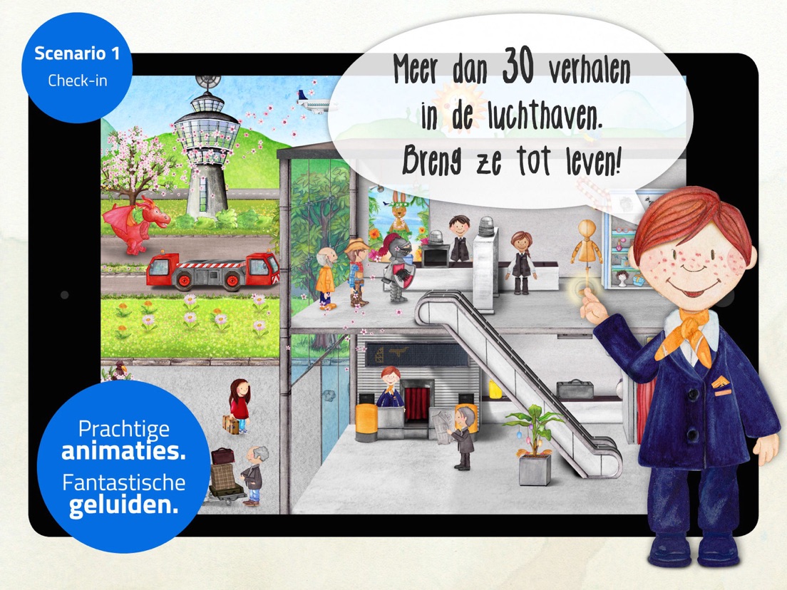 Er zijn drie scenario’s met ongeveer 90 verborgen animaties en mogelijkheden om verrassingen te onthullen. Zo zullen kinderen van 3 tot 6 jaar meer leren over de verschillende ruimten in de luchthaven. Ze zullen ook veel gekke en tedere verhalen tot in het kleinste detail ontdekken: