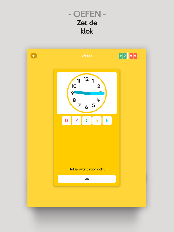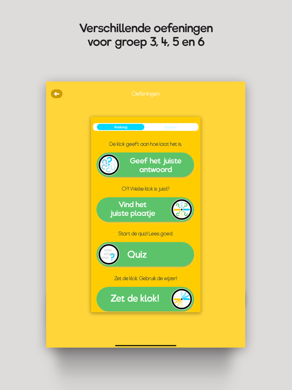 KlokWijs geeft ondersteuning met 2 verschillende type klokken, analoog en digitaal, bij elk oefening!