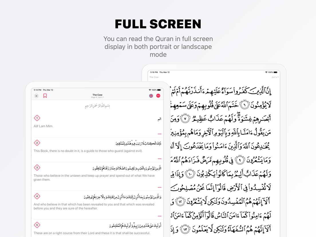 Read the Holy Quran in Arabic alongside its translation ( French, English, Malay, Dutch, Italian, Spanish, or even have explanation and meaning). We support 30 languages in total.