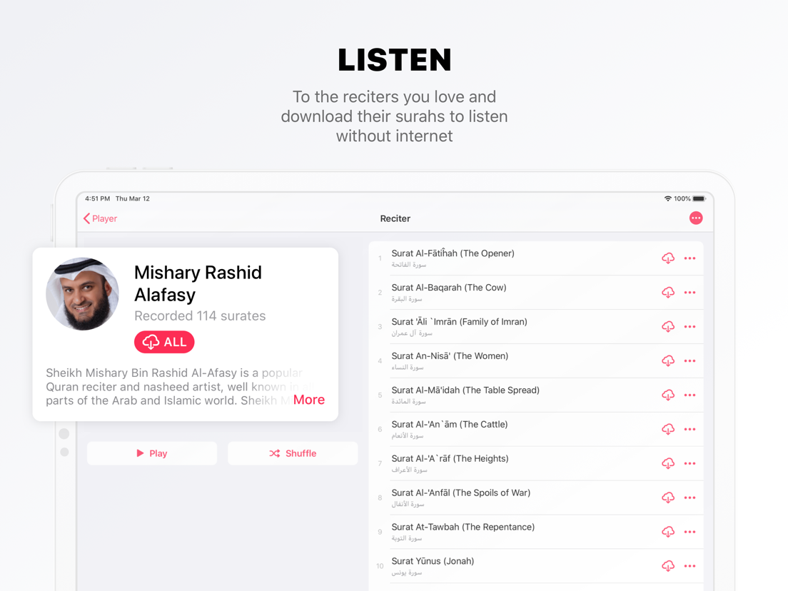 Download recitations, playlists, and tracks, and bring your Quran with you anywhere using our offline mode. Download all the surats or one by one surat.