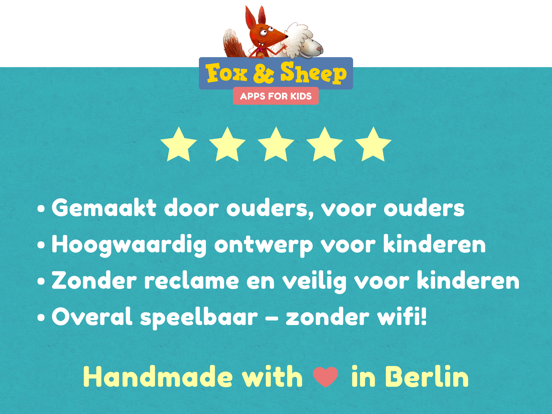 Wij zijn een studio voor kinderapps uit Berlijn en wij maken hoogwaardige spellen voor kinderen van 2-8 jaar. Zelf zijn wij ook ouders, en wij werken met passie en betrokkenheid aan onze producten. Voor onze apps kiezen wij de beste illustrators en animators, om zo de allermooiste apps voor kinderen te kunnen maken en aanbieden ¬– en zo het leven van jullie en onze kinderen te verrijken.