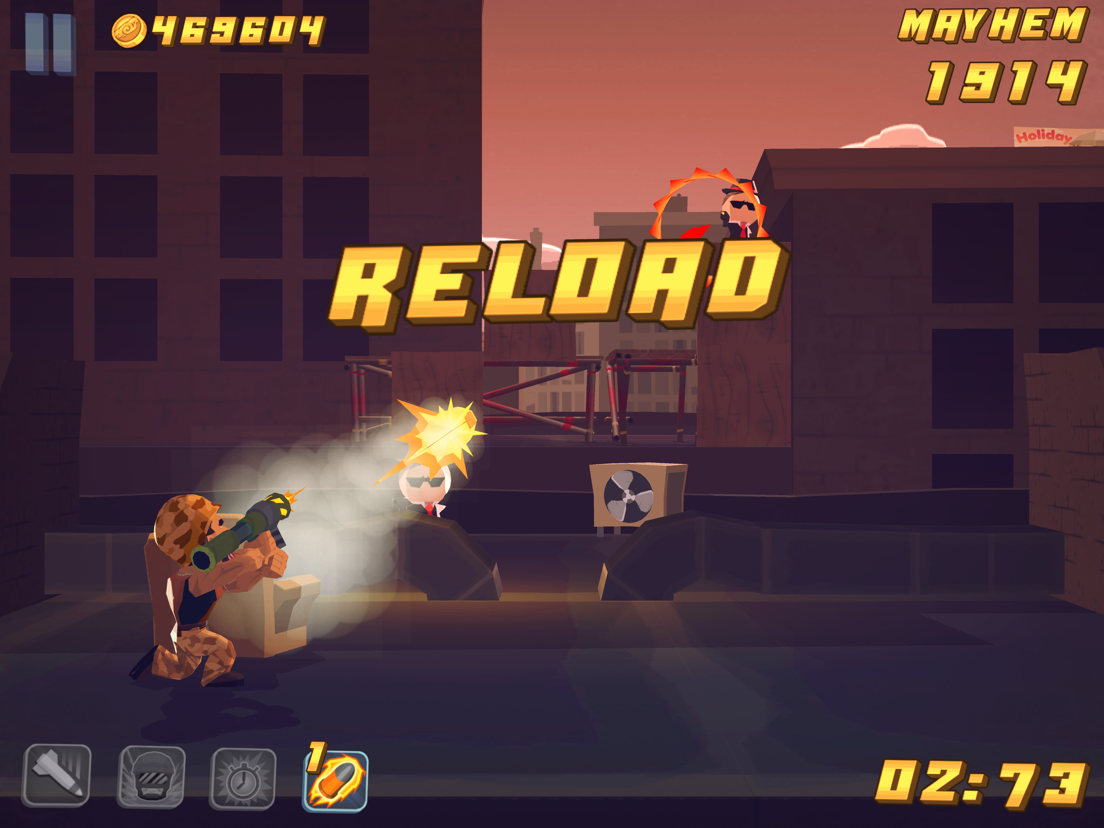 >> "…extremely enjoyable and addictive. Major Mayhem takes elements from an Operation Wolf style shooting gallery, Canabalt platforming, Gears of War duck-and-cover and Max Payne bullet time, and mixes it into an action-packed budget platformer that’s hard to put down." —TouchGen