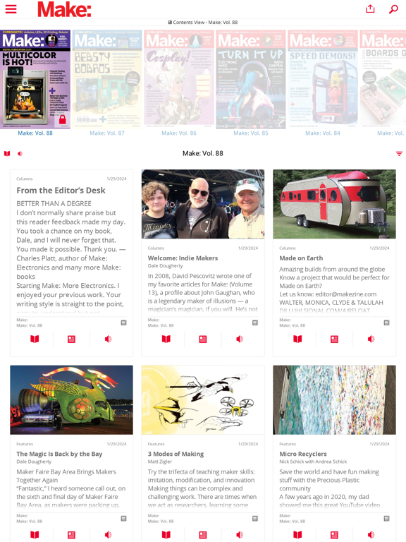 The Make: app is the digital magazine format of Make: magazine that you can take on the go, and enjoy on any smart device. It has everything you’ll find in the magazine’s pages and more.